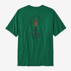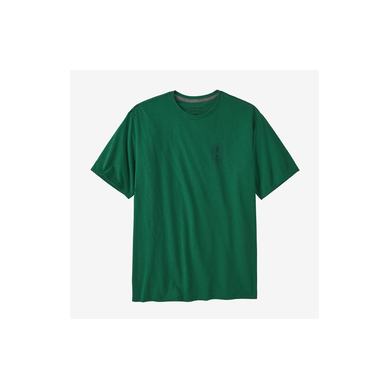 Camiseta de Patagonia 100% reciclada a partir de retales de algodón sobrantes y botellas de plástico. Para su fabricación se a utilizado un 96% menos de agua y se ha producido un 45% menos de CO2 que para una camiseta convencional. Las serigrafías del logo no contienen ni plástico no pfalatos contaminantes.  Dispone del sello Fair Trade por ser una prenda de comercio justo.